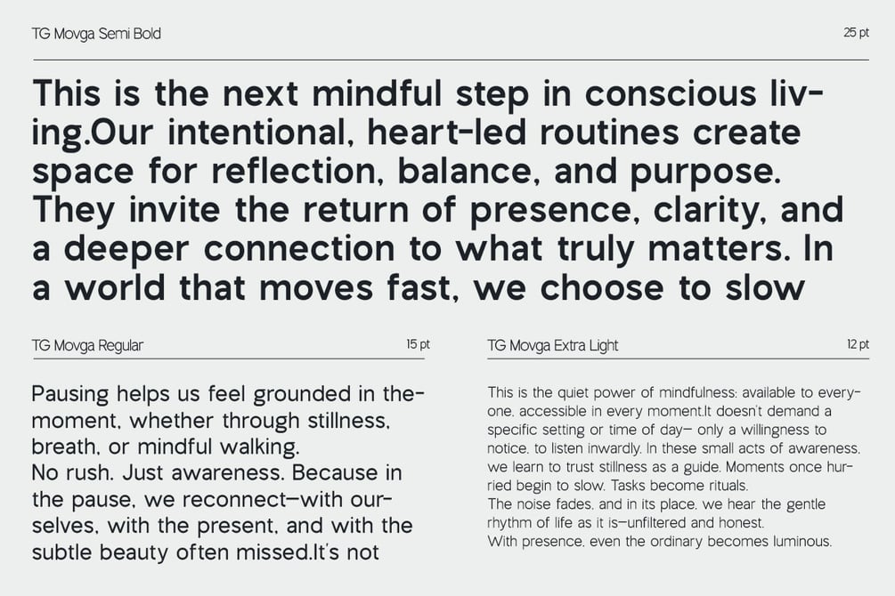 See how TG Movga appears before us today. With its clean yet distinctive design, this font isn't just an option, it's a solution. Every curve and line has been meticulously designed to ensure optimal readability, whether on your smartphone screen or in a premium print magazine.